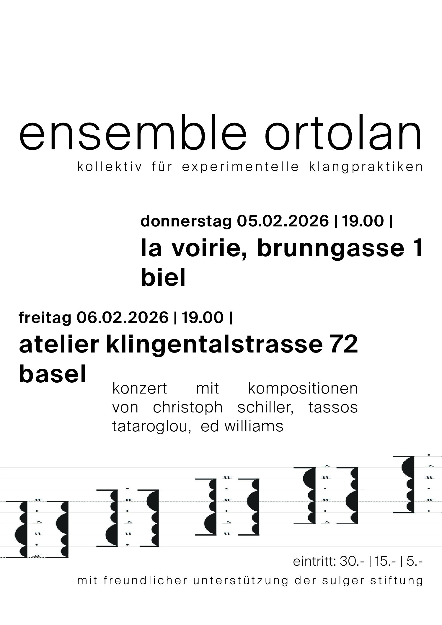 Ortolan est un ensemble de musique contemporaine basé à Bâle qui se consacre à la création collective, aux pratiques sonores expérimentales et à l’exploration du silence et de l’écoute. Faisant appel à un langage minimaliste, le groupe réunit des musicien·ne·s d’horizons musicaux et culturels variés en intégrant des instruments anciens et de l’électronique dans un espace commun de composition ouverte et d’improvisation.