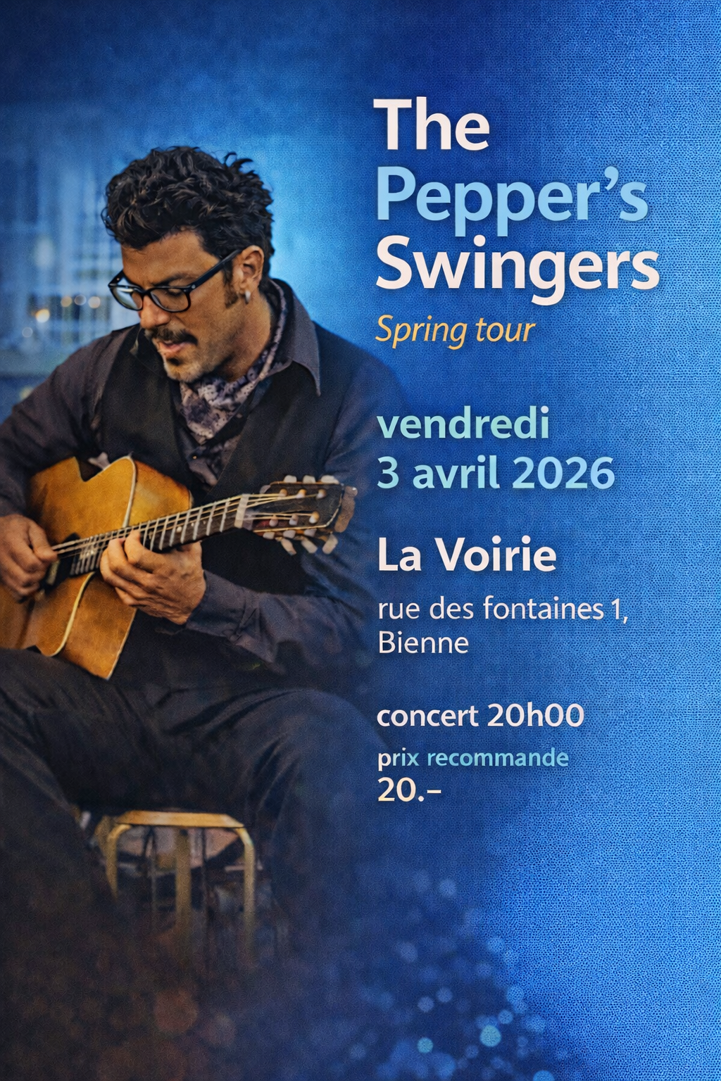 Du 27 mars au 15 avril 2026, les The Pepper’s Swingers parcourent la Suisse romande pour une tournée printanière, accompagnés du brillant violoniste breton Youenn Rohaut. Dans le cadre de ce périple entre le Jura et Neuchâtel, ils feront escale à La Voirie le 3 avril à 20h00. Le concert, organisé en deux sets de 45 minutes, promet une soirée de swing chaleureux mêlant avec élégance les cultures romandes et bretonnes.